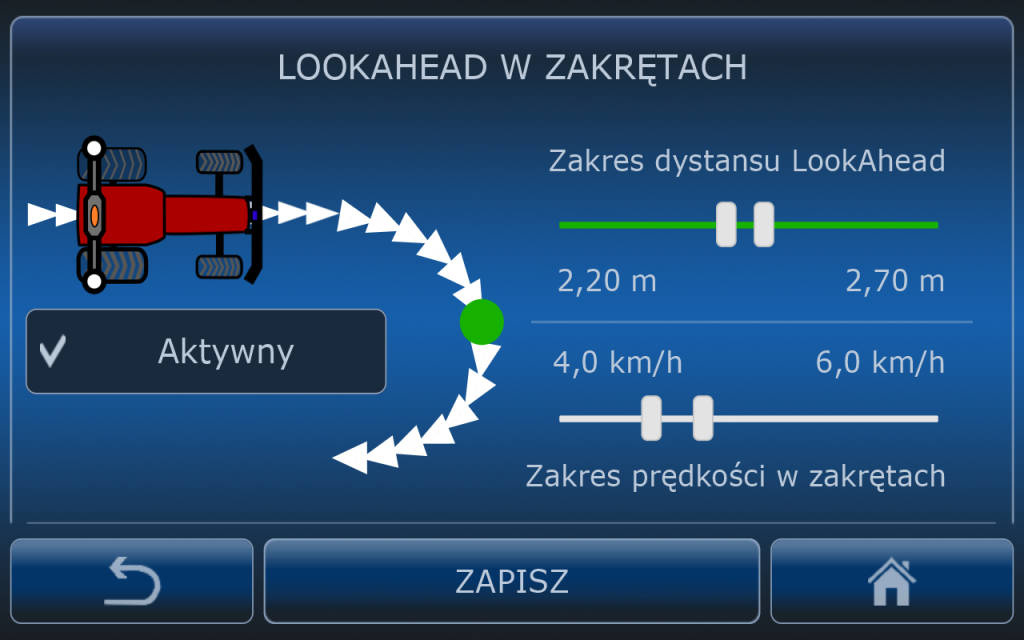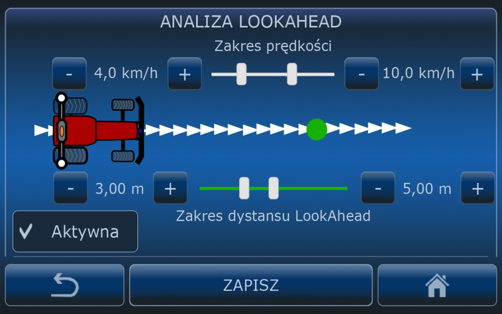 - zakres dystansu LookAhead, który będzie obowiązywał w granicach zakresu prędkości.