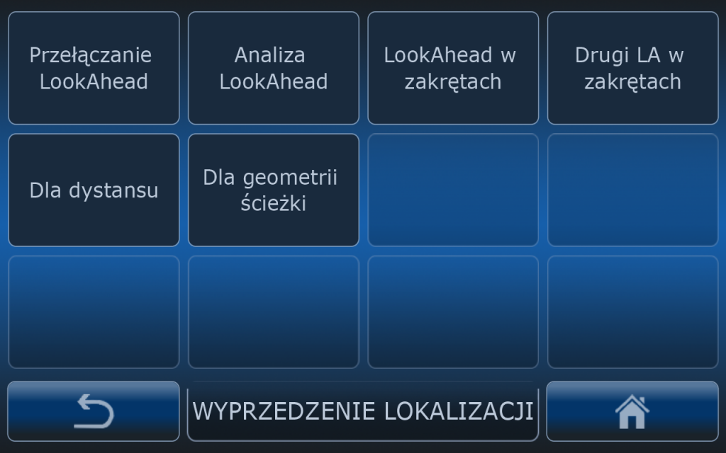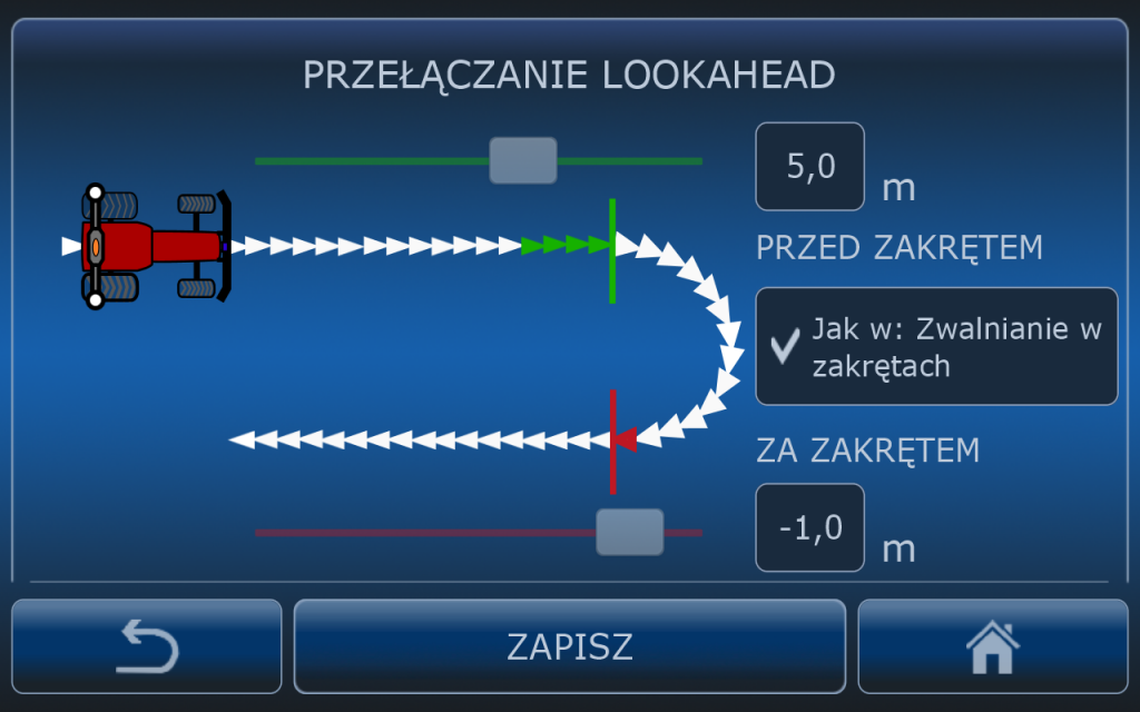 W menu Przełączanie LookAhead dokonuje się ustawień momentu przełączania punktu LA przed i za zakrętem.